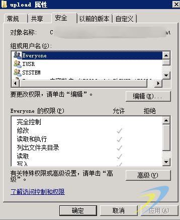于是查看上傳目錄,目錄的權限已經(jīng)包含"Everyone",目錄應該也沒(méi)有問(wèn)題(之前上傳的圖片都可以訪(fǎng)問(wèn))